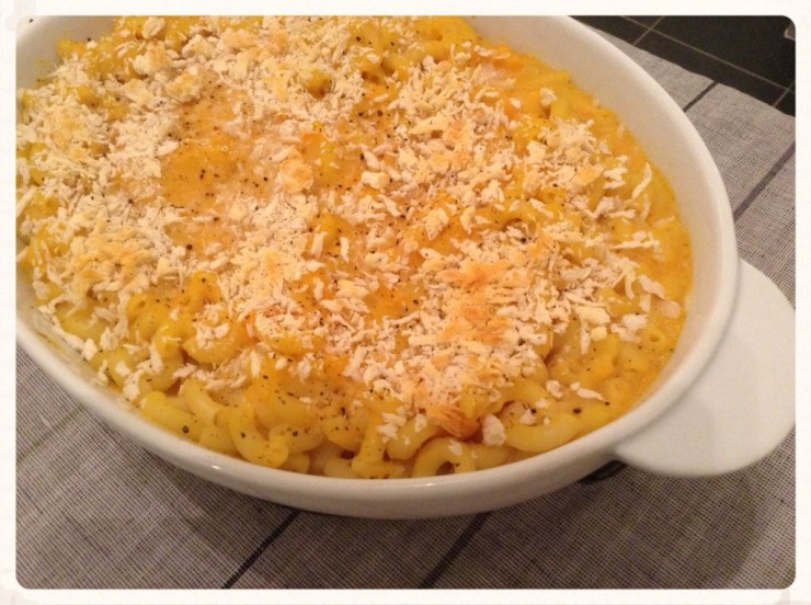 Place flesh down on a baking tray with 100ml of water & roast for around an hour or until the flesh is soft and squishy. Let it cool a little before you scoop out. Or if not, scoop, jump around shouting ayeya and burn your fingers. Put in a blender with coconut milk and whizz until smooth. Transfer into a pot and heat for a few minutes before adding in crumbled stock cube, Dijon mustard and cider vinegar. Add salt and lots of black pepper. Cook for around 20 minutes until it starts to thicken and become paler. If it tastes a little sweet for you because of the coconut milk add a little more mustard and vinegar, until it gets to a taste you are happy with. I’m guessing whole grain mustard would be nice too.Add cooked macaroni to sauce, mix in and transfer into ovenproof dish for 10 minutes. You can sprinkle on some bread crumbs on top if you want more of a ‘roni crust or just tuck straight in. Guaranteed to satisfy the vegan cynics.